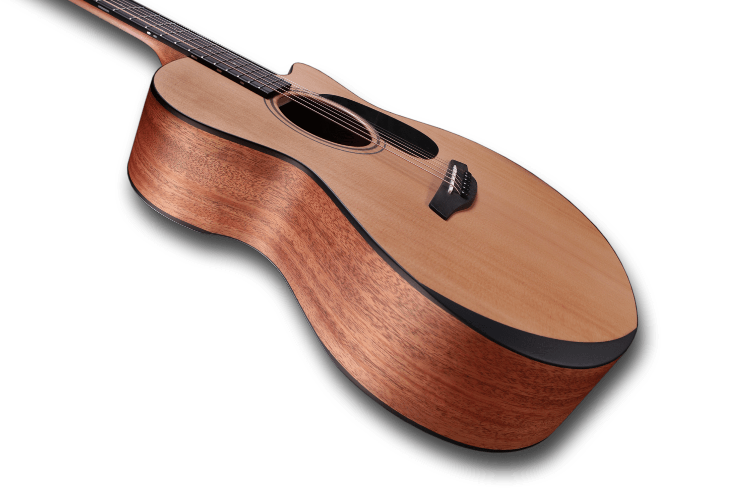 The Blue Deluxe CM is made from carefully selected tonewoods that produce a beautiful musical sound across the entire tonal range with slightly pronounced lows. The soundboard features Western red cedar, the back and sides are from African mahogany. Both plates are complemented by the ergonomic Bevel Duo feature, which provides maximum comfort even during prolonged play. The beautiful natural appearance of the Blue Deluxe CM is underscored by open-pore finish and a host of delicate dark-colored appointments, such as double ring rosette with black walnut inlay, black body binding and black pickguard.