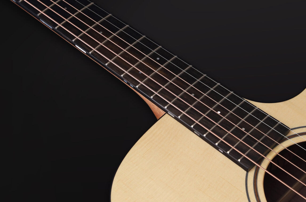 The ebony fretboard is embellished with pearl front dot and side linear position markers, enhancing fretboard orientation while adding to the guitar’s elegant appearance.