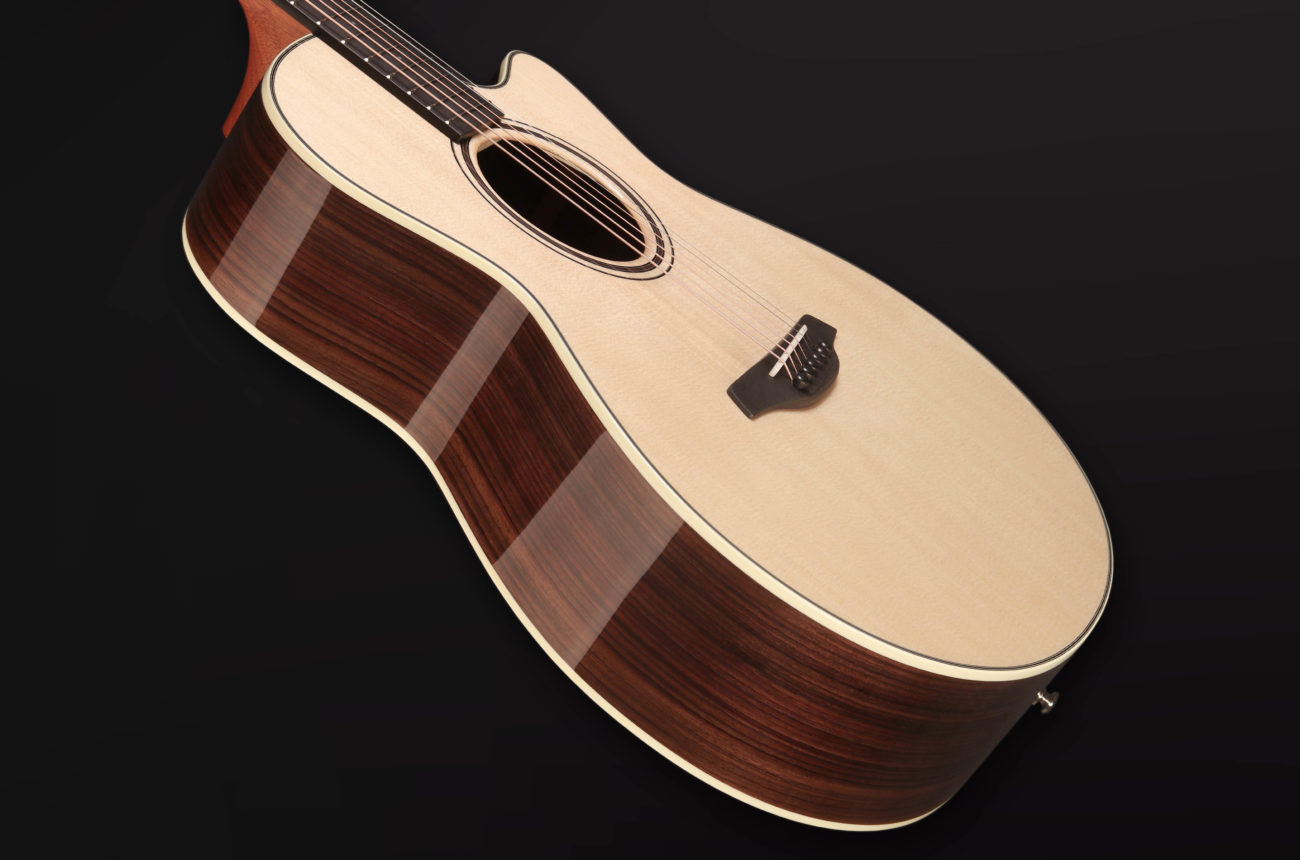 The soundboard of the Green SR owes its stylish look to a combination of faux tortoise body binding and a rosette featuring a double ring with a black walnut inlay.